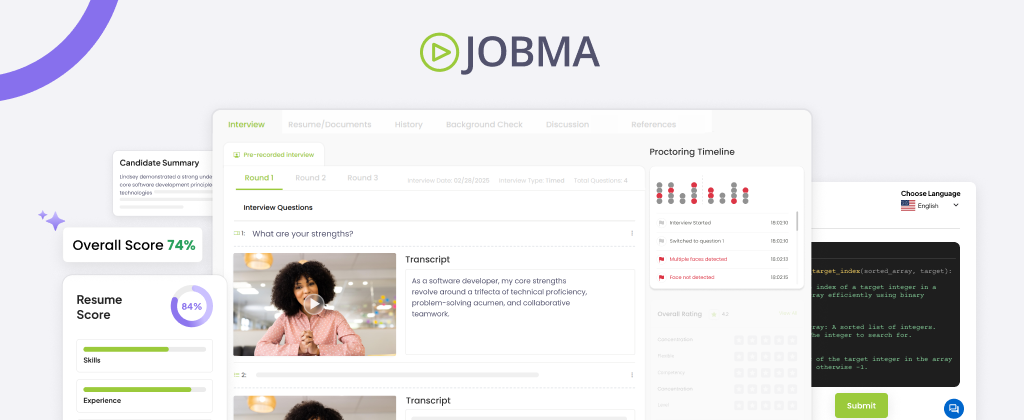 Jobma is an asynchronous video interview platform trusted worldwide. It’s used by organizations across industries like Healthcare, Education, IT, Staffing, and others. The platform supports asynchronous, live, and AI-assisted interviews while offering deep intelligence tools, powerful analytics, and ready-to-use system infrastructure.