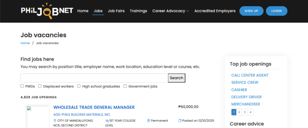 PhilJobNet is the official job portal of the Philippine Department of Labor and Employment (DOLE). It consolidates verified openings from government agencies, private companies, and training institutions. The site also includes labor market tools, skills assessments, and job matching features.