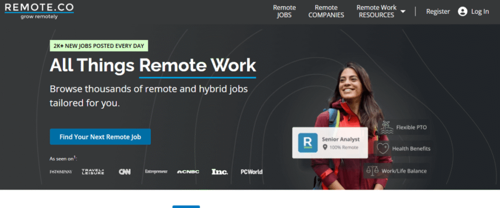 Remote.co focuses exclusively on vetted remote positions ranging from entry-level to executive roles. It covers listings across tech, HR, customer service, finance, and creative fields. It also provides educational content on remote work best practices.