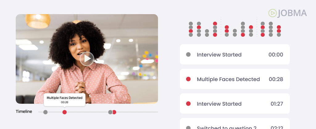 For example, Jobma’s AI proctoring tracks behaviors like multiple faces appearing on the screen, rapid eye movement suggesting off-screen reading, and unusual background changes. These cues don’t automatically disqualify a candidate, but they give recruiters a reason to take a closer look.