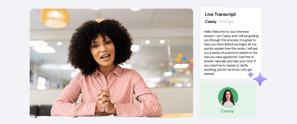 Every AI-led session generates real-time transcripts. These transcripts are stored and time-stamped with the interview, allowing for convenient record-keeping and quick reference. Transcripts also make it easier to: