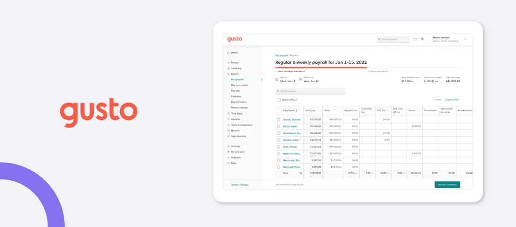 Gusto automates and simplifies payroll, benefits, and compliance for small and medium-sized businesses. It handles everything from time tracking and calculating taxes to managing insurance payments. The tool offers a user-friendly interface that ensures employees are paid accurately and on time, while staying on top of state and federal regulations.