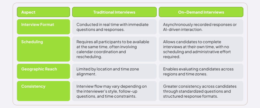 Over 87% of companies use video interviews. With the rising adoption of AI tools in recruitment, ongoing research suggests that this number is expected to rise in the coming years. But how are on-demand interviews different from traditional ones?