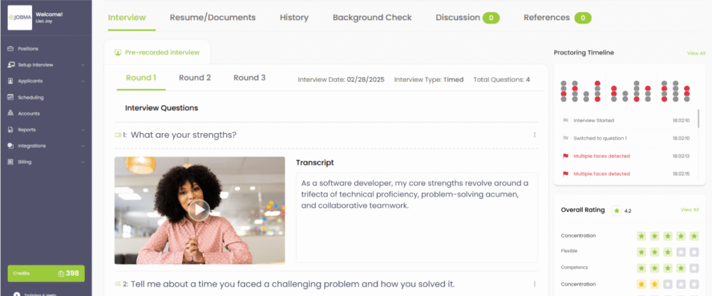 Because every candidate receives the same prompts and response conditions, evaluation becomes more consistent. Recruiters can pause, replay, compare responses, and access smart performance insights within the interviewing platform rather than relying on memory or handwritten notes. In high-volume hiring environments such as retail, customer support, and campus recruiting, this structure enables simultaneous screening of hundreds of applicants without requiring live interviewer bandwidth, bringing down review time from days to minutes.